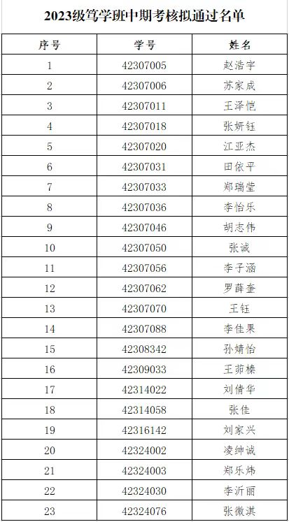 根据教务处《关于做好2023级“人文科学试验班”“理科试验班”中期考核及二次选拔工作的通知》和《天使动漫 2023级化学笃学班中期考核和二次选拔实施办法》,学院对2023级化学笃学班进行了中期考核,现将结果予以公示,公示时间:2024年9月20日-9月22日。天使动漫 23名学生通过考核,结果如下(按照学号顺序排序),现予以公示。如有异议者,请与学院党委副书记、纪委书记贾颍辉同志联系,联系电话:13572524231,邮箱:[email protected]。