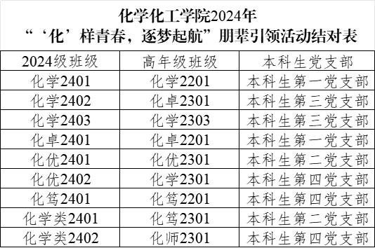 2024级本科生迎新、入学教育及各项相关工作,引导新生坚定理想信念,尽快了解新生活、适应新环境、转变新角色,加强新生班级(团支部)建设,营造健康向上的班级氛围,有效发挥朋辈在信息咨询、学业解惑、思想引领、生活指导、校园文化传播等方面的引领作用及榜样作用,经研究,学院党委、团委决定开展2024年“‘化’样青春,逐梦起航”朋辈引领活动。现将活动实施方案通知如下: