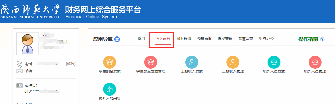 登录:进入学校主页“一网通办”栏目,选择“财务系统”,点击“收入申报”