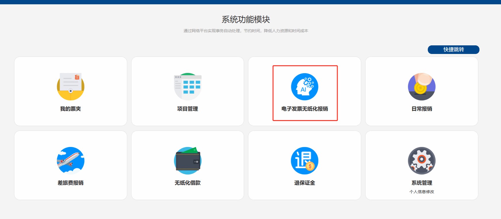 (1)在系统功能模块选择“电子发票无纸化报销”。