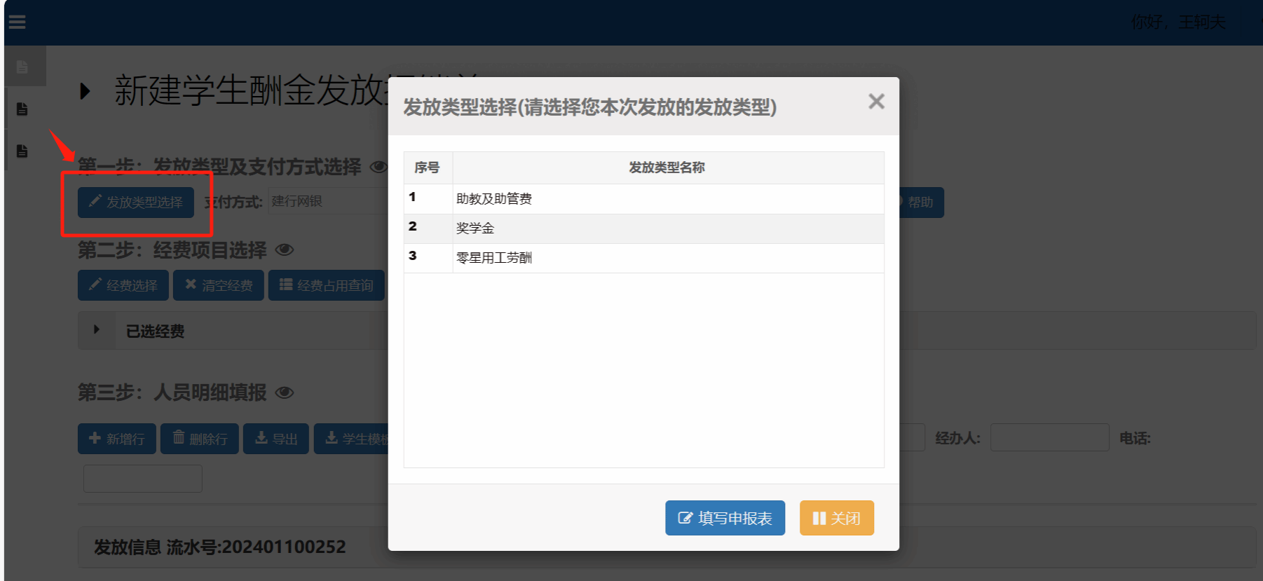 (1)经办人(必须是老师账号)新建学生酬金发放单,选择发放类型,双击选择需要的发放类型