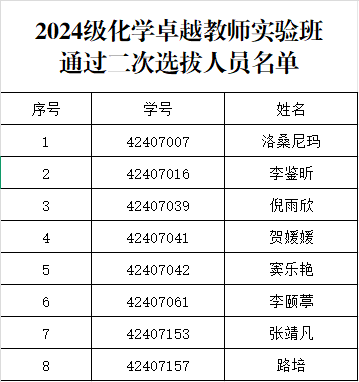 根据《关于开展2024级卓越教师实验班中期考核、二次选拔工作的通知》和《天使动漫 2024级卓越教师实验班中期考核、二次选拔考核方案》,经学生自主报名、学院资格审核,现将2024级卓越教师实验班二次选拔结果公示如下: