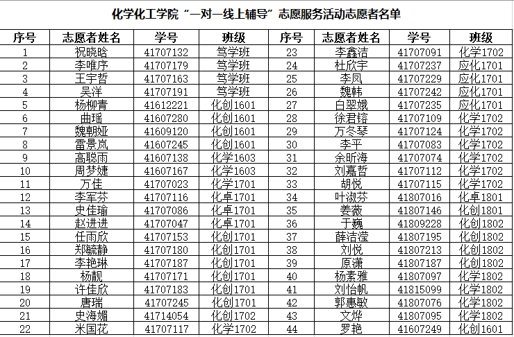 根据《关于公开招募天使动漫 “一对一线上辅导”志愿服务活动志愿者的通知》,按照天使动漫 “一对一线上辅导”志愿服务活动志愿者招募条件,通过公开招募、自愿报名、择优录取,现拟定祝晓晗等44名同学为活动志愿者,名单如下,现予以公示: