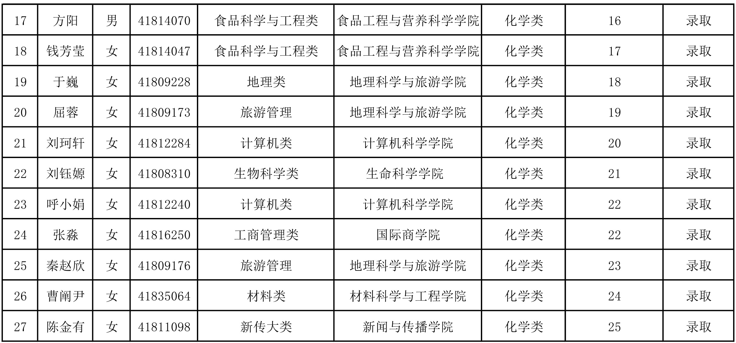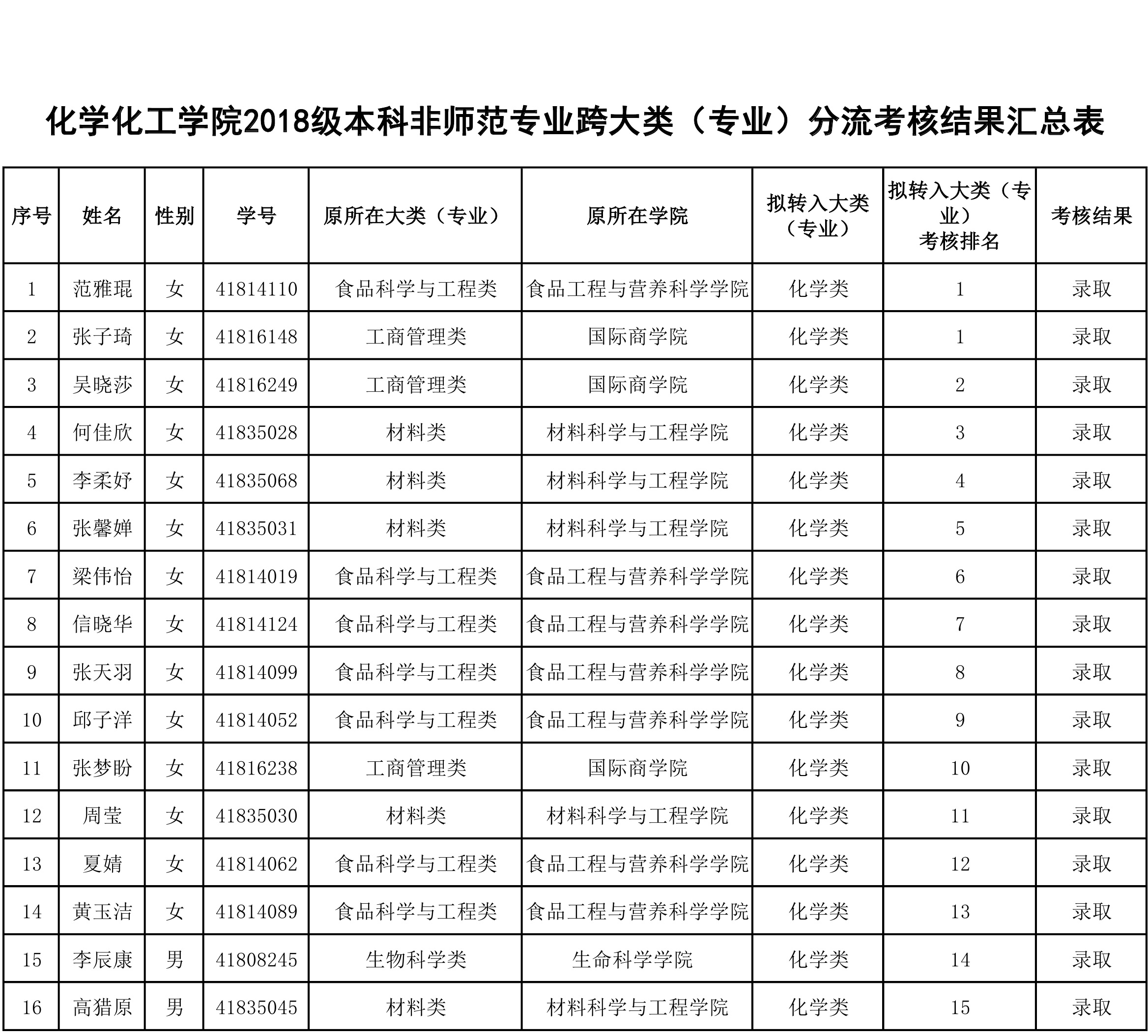 根据《天使动漫 本科非师范专业大类招生培养改革方案(试行)》办法,天使动漫 对2018级申请转入化学类的非师范专业学生进行笔试和面试综合考核。现有27名学生通过考核,现将学生名单公示如下: