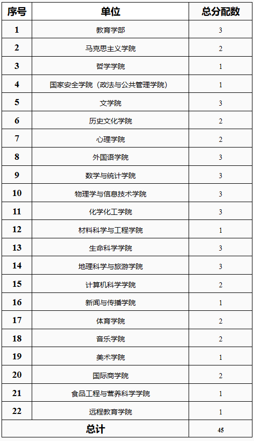 根据人力资源部提供的各教学单位最新专任教师人数,分配本学年教学质量优秀奖候选人名额,具体分配情况见表: