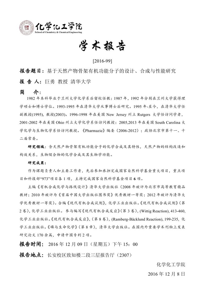 巨勇教授学术报告预告[2016-99]