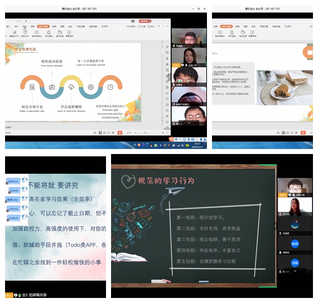 2019级化学(卓越教师实验班)通过观看视频,分析线上学习模式与传统学习模式的区别,揭露网课学习中的不良现象,同时以“作为未来教师,如何看待网络直播授课?”展开讨论,号召同学们学会换位思考,积极适应新模式,树立优良的学风。化学1902班以“自律生活,自觉学习”为主题,通过解释“自律者自由”的含义、讲解自律形成的过程规律、介绍“现场放松”和“想象放松”等解压方法,鼓励同学们养成自觉的习惯,提高学习效率,做到在生活中自律,在学习中自觉。化学1903班以“线上学习”为主题,通过在线分享学习方法、展示学习成果的方式,围绕“网络课程的优点” “行为规范的培养” “时间管理的妙招”等话题展开云端讨论,呼吁同学们积极调整状态,经受住特殊时期对学习意志和生活习惯的考验。