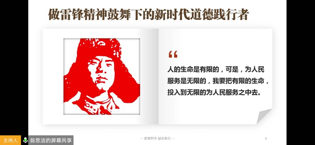 最后,龙卓华就本次会议进行总结。在这场疫情攻坚战中,我们国家能行动迅速、效果显著,离不开中国共产党的领导,在此次疫情防控中涌现出许多新时代雷锋精神的代表。她强调,雷锋精神常学常新,需要我们不停地学习与实践。她引用“如果你是一滴水,你是否滋润了一寸土地?如果你是一线阳光,你是否照亮了一分黑暗?如果你是一颗粮食,你是否哺育了有用的生命?如果你是一颗最小的螺丝钉,你是否永远坚守在你生活的岗位上?”引发全体党员进行反思,希望大家能像雷锋一样做青年的先锋,用实际行动践行雷锋精神,在他人需要帮助之时率先伸出自己温暖的手。同时,她也希望疫情早点过去,与大家一同期待春暖花开、万物复苏。