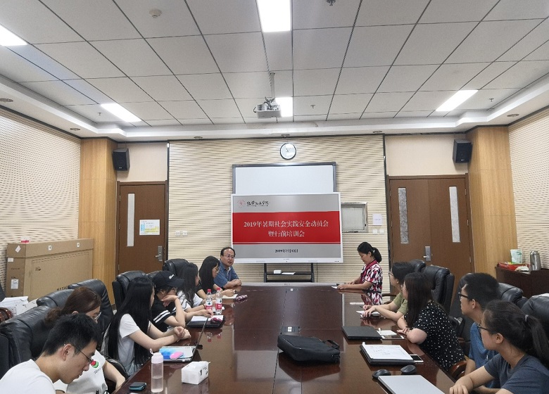 在致知楼1362会议室召开暑期社会实践安全动员会暨行前培训会。学院党委副书记王晓、团委书记陈钿,辅导员邓文珺及14名实践队员参与此次会议。