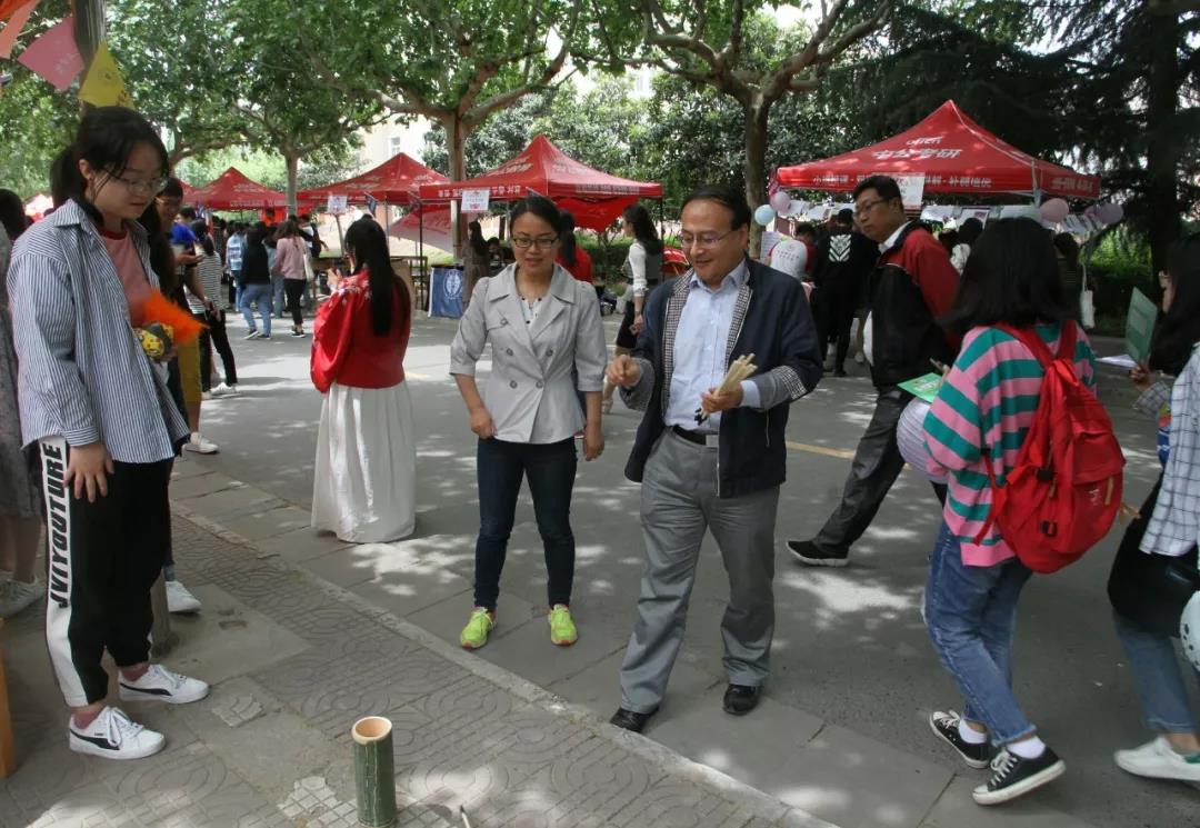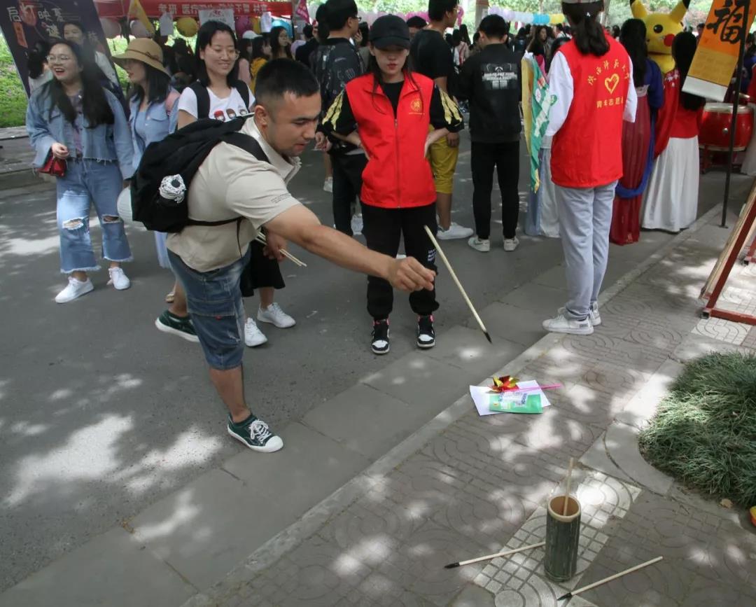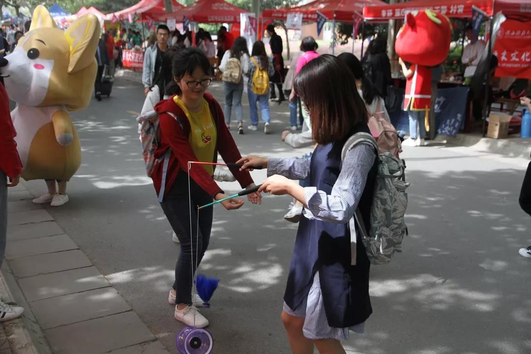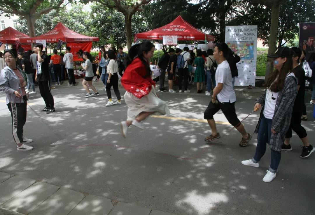 党委副书记王晓老师和团委书记陈钿老师在百忙之中赶到现场,与学生一起跳绳,踢毽子,并体验投壶和抖空竹项目,现场一片欢声笑语。
