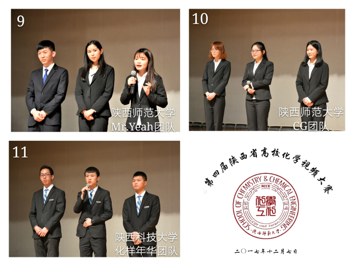 等七所高校的43支参赛团队,参赛选手除了化学专业学生,还有来自我校新闻传播学院、文学院、美术学院、计算机科学学院的学生。经过初赛的激烈选拔,共有11支队伍的作品入围决赛。担任本届大赛决赛的现场评委有:西北工业大学耿旺昌副教授、西北大学韩小龙副教授、陕西科技大学胡亚薇副教授、西安科技大学贺新福副教授、西安石油大学孟祖超副教授、我校天使动漫