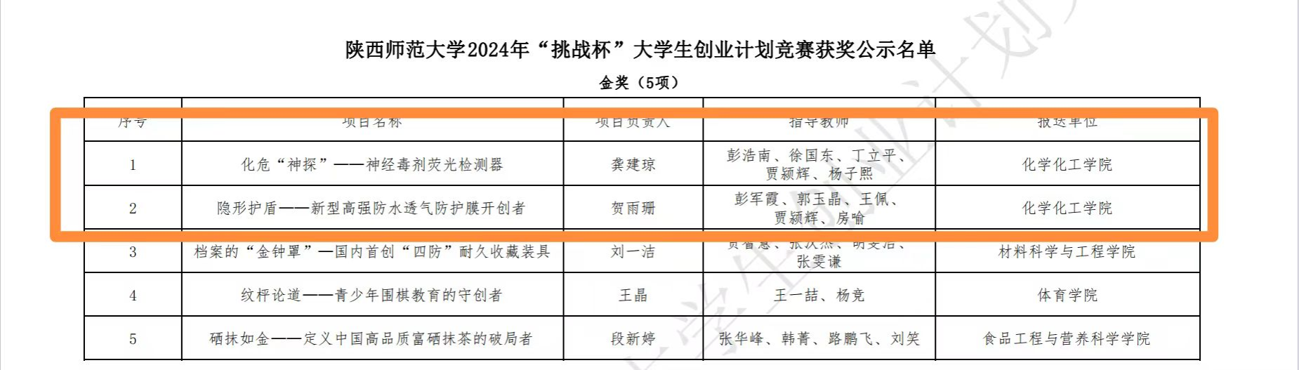 其中,由彭浩南教授等指导的项目《化危“神探”——神经毒剂荧光检测》以及彭军霞教授等指导的项目《隐形护盾——新型高强防水透气防护膜开创者》获得校级金奖;由刘太宏副教授等指导的项目《氯感卫士——新型便携式含氯气体薄膜荧光传感检测仪》获得校级铜奖;由赵健副研究员等指导的项目《牙齿卫士——纳米生物牙齿自修复材料的引领者》获得校级优秀奖。