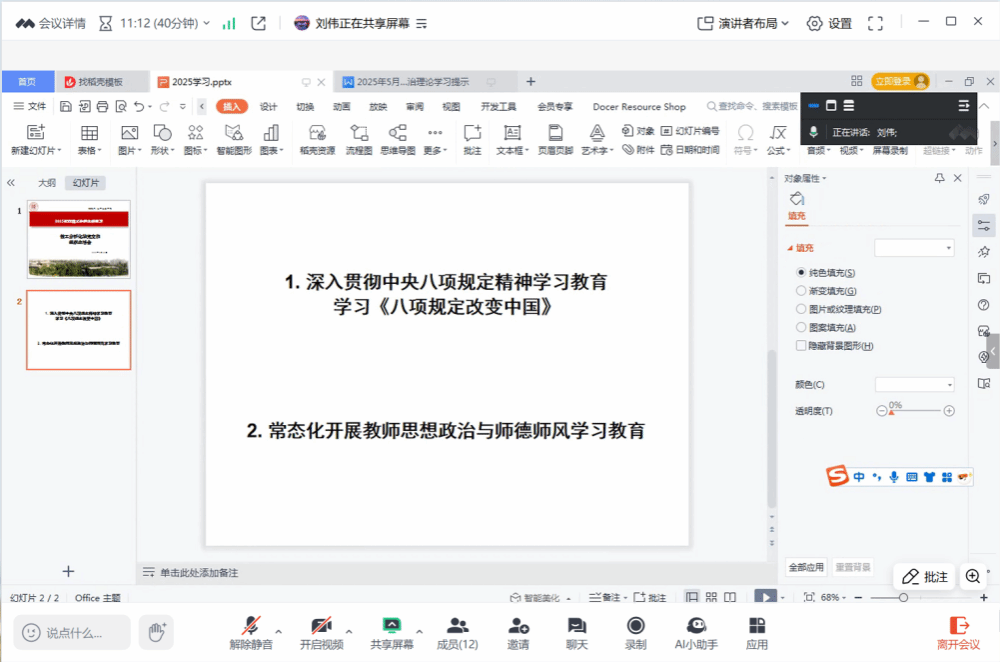 教工无机化学党支部联合无机化学教学团队开展专题理论学习,会议聚焦教师思想政治教育、师德师风建设及中央八项规定精神落实。支部书记翟全国解读中央八项规定及其精神内涵与违反表现。支部全体党员观看“最美教师”宣传片,并结合教学工作进行深入讨论。本次学习强化了党员教师的政治意识,稳固师德根基,推动廉洁从教理念入心,为营造良好育人环境提供了保障。