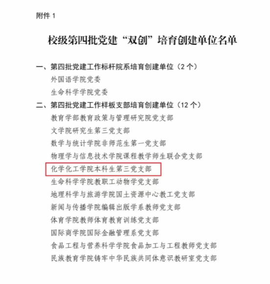 近年来,学院党委坚持以习近平新时代中国特色社会主义思想为指导,深入贯彻落实新时代党的建设总要求和新时代党的组织路线,以党建“双创”建设为抓手,推动党建与业务深度融合。自党建“双创”建设工作启动以来,学院党委获批陕西省高校党建工作标杆院系、陕西高校先进基层党组织,教工无机化学党支部获批省级党建工作样板支部,教工无机化学党支部书记工作室获批首批全国高校“双带头人”教师党支部书记工作室,基层组织建设的带动引领和示范效应持续彰显。