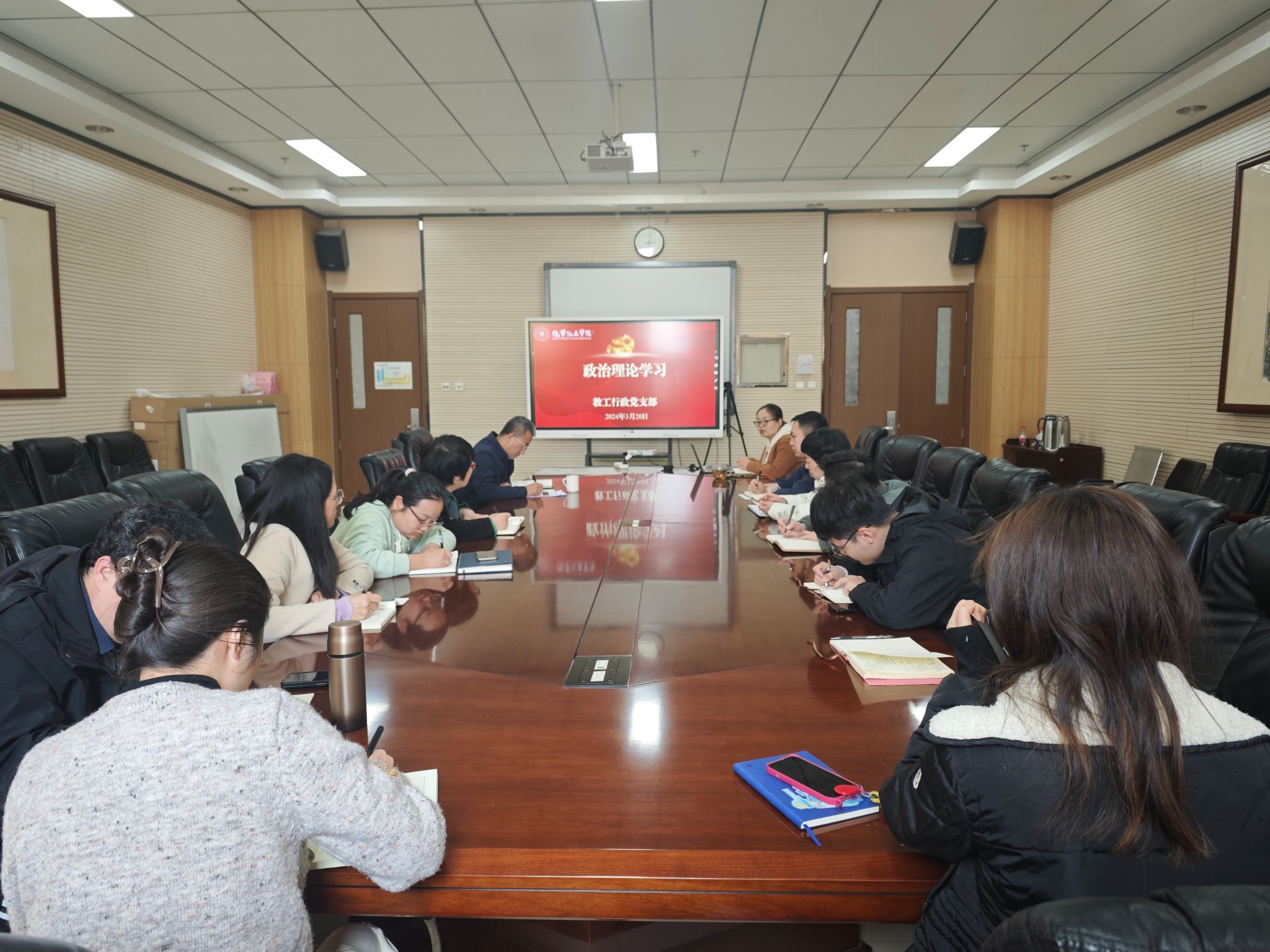教工行政党支部在致知楼1362会议室进行了3月份的集中理论学习,党委委员肖新军面向支部全体党员及联系教师宣讲了2024年全国“两会”精神,解读了“新质生产力”相关内容。与会成员集体学习了习近平总书记关于师德师风的重要论述等相关学习材料,讨论了支部本年度重点工作。