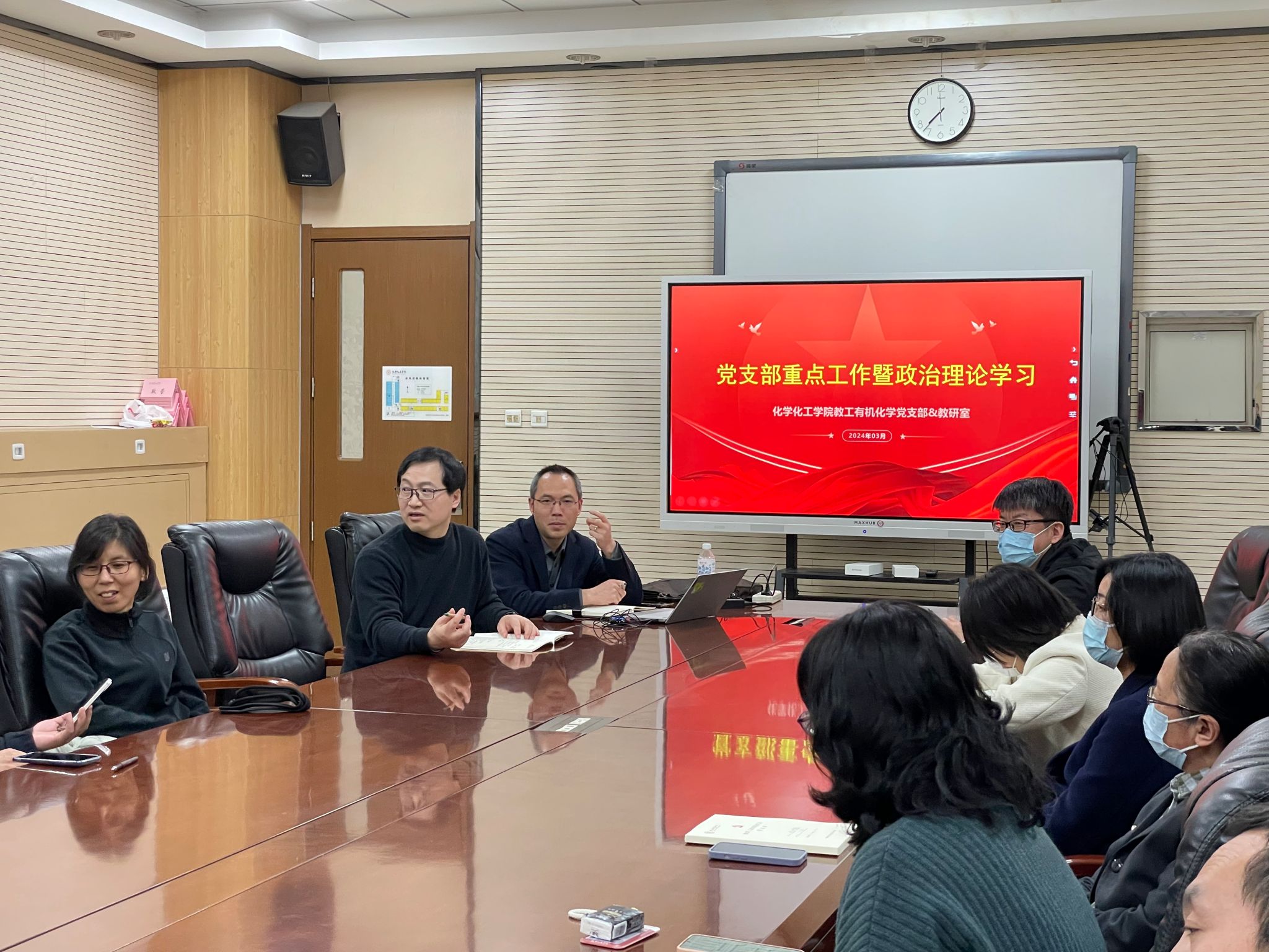 教工有机党支部于3月28日晚进行集中理论学习,并组织有机化学课程教学交流。会议还讨论了有机工会小组的活动安排,进一步促进教师之间的交流。