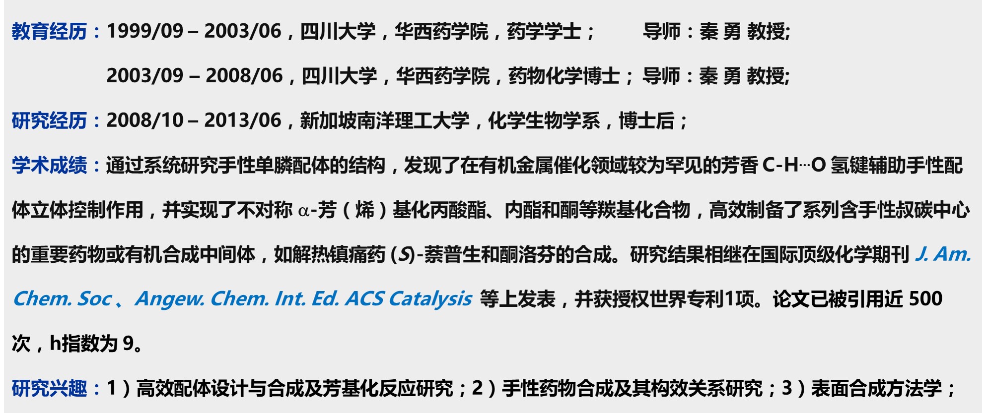 • 研究方向:芳基化、光催化、表面合成以及手性药物合成