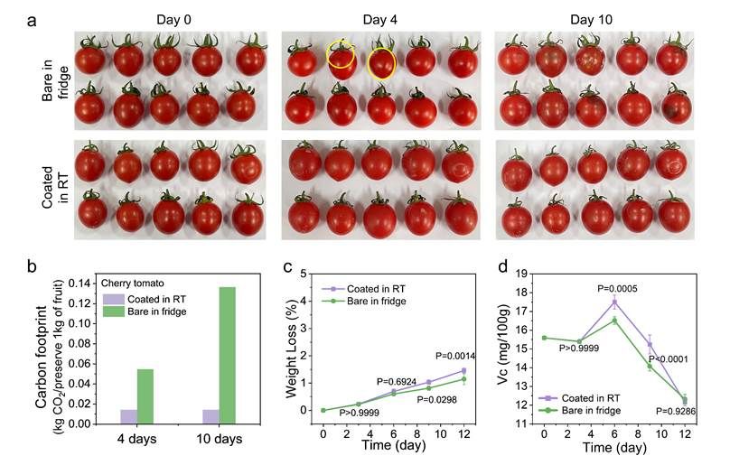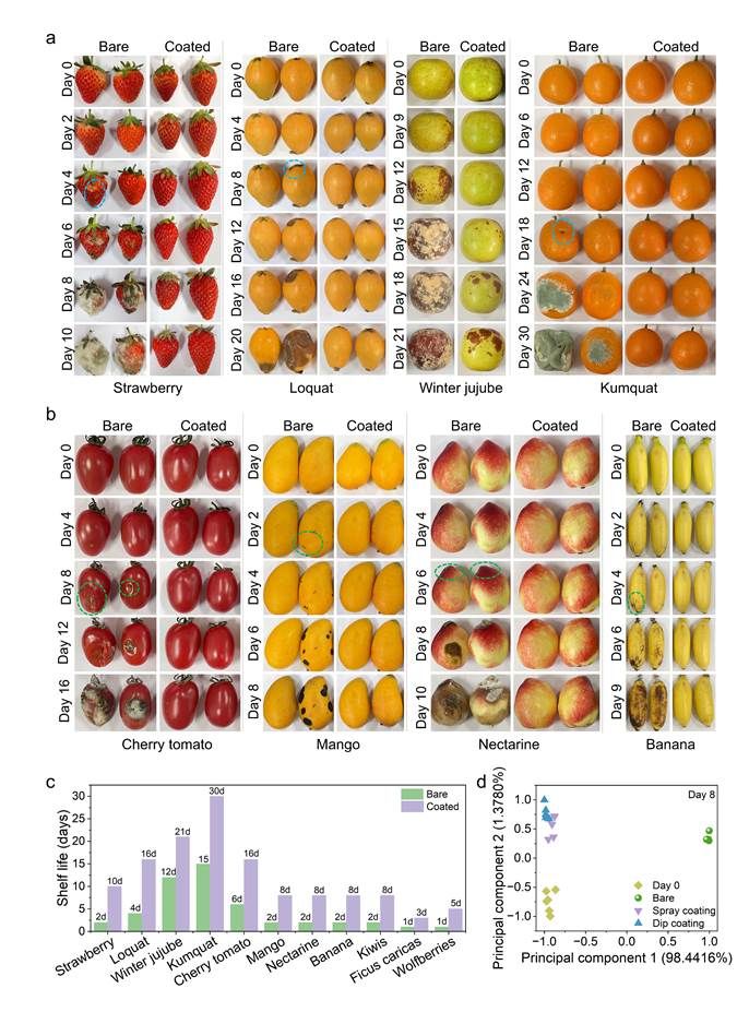 生物表界面与智能大分子研究团队提出采用类淀粉样蛋白涂层实现水果保鲜。开发了一种可持续的类淀粉样蛋白涂层(ALP),通过分子动力学模拟,证明了ALP在水果表皮蜡质上具有较好的粘附稳定性。通过与海藻酸钠(SA)和纤维素纳米晶(CNC)体协同作用,进一步增强了涂层的成膜能力和气体阻隔性能。该ALP涂层不仅显著抑制了微生物的生长,而且显著减少了33%-69%的水分流失,保留了60-98%的营养物质,并减缓了水果变质的速度,可广泛用于采后水果保鲜和鲜切水果保鲜,使货架期提高了2-5倍。同时,该涂层具有生物安全性,且涂层易于清洁,进一步确保了可食用性和可洗性,处理成本仅为每公斤水果0.66元人民币,为解决全球食物浪费问题的切实可行的解决方案,也是促进绿色可持续食品保鲜技术发展的新途径。