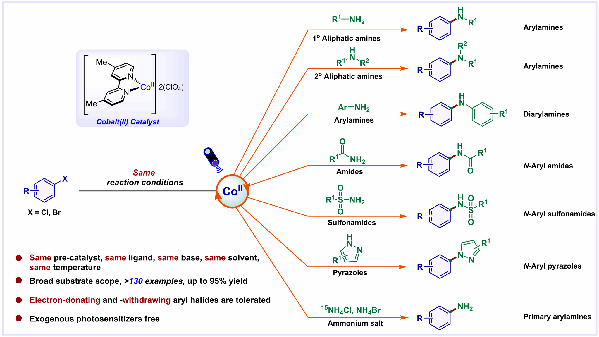 过渡金属催化的C-N偶联反应为芳胺及其衍生物的合成提供了重要方法,已成为药物合成领域最常用的20个反应之一。然而,默克公司(Merck)的研究表明:基于∼10000个实例的数据分析,C-N偶联反应的失败率仍然高达 35%。究其原因,目前广泛使用的过渡金属催化剂体系在很大程度上依赖于各种特定配体、前催化剂的设计、合成,以及针对不同类型的含氮底物开展的催化剂筛选和反应条件的逐一优化,导致缺乏通用性C−N偶联反应催化剂体系。为突破这一瓶颈,基于机器学习、人工智能与高通量实验(HTE)结合筛选反应条件的策略近年来得到了快速发展。考虑到C-N 偶联反应在合成化学中的重要性,开发通用性 C-N 偶联催化剂新体系(使用相同的前催化剂、配体、溶剂、碱和温度)为C-N偶联反应的发展提供了新的策略。钴(Co)是一种低毒且储量丰富的金属,由于其高的催化活性,钴催化剂被视为贵金属催化剂的理想替代品。Co催化剂在C-C键交叉偶联反应领域已经得到了广泛的应用,但是在构筑C-N键方面的应用还十分有限。天使动漫