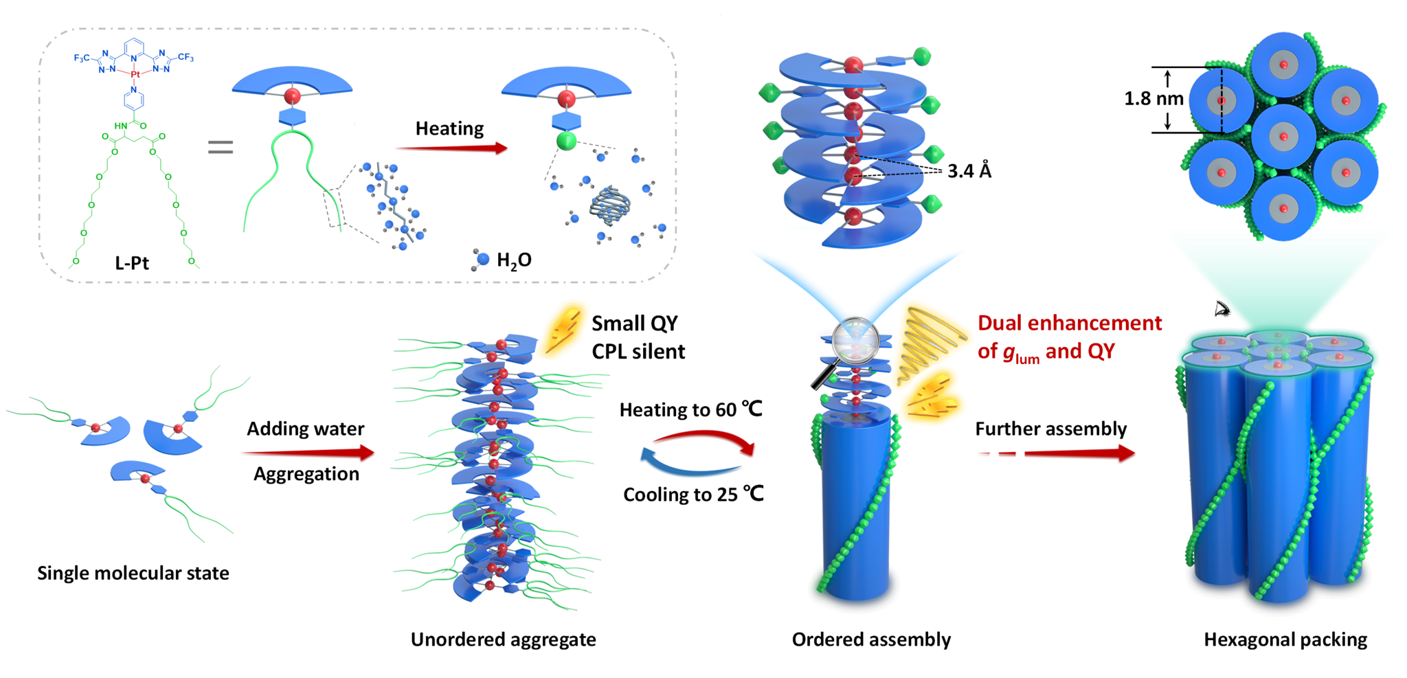 图1 铂(II)配合物熵驱动自组装实现手性组装体发光不对称性和发光效率的同步增大