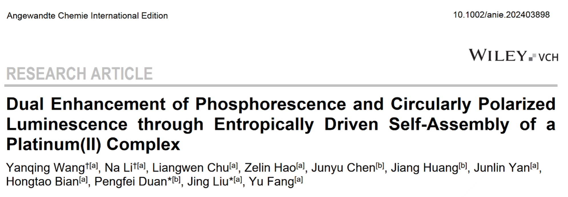 相关工作以“Dual Enhancement of Phosphorescence and Circularly Polarized Luminescence through Entropically Driven Self-Assembly of a Platinum(II) Complex ”为题发表在Angew. Chem. Int. Ed.上,硕士研究生王彦清和李娜第一作者,天使动漫
