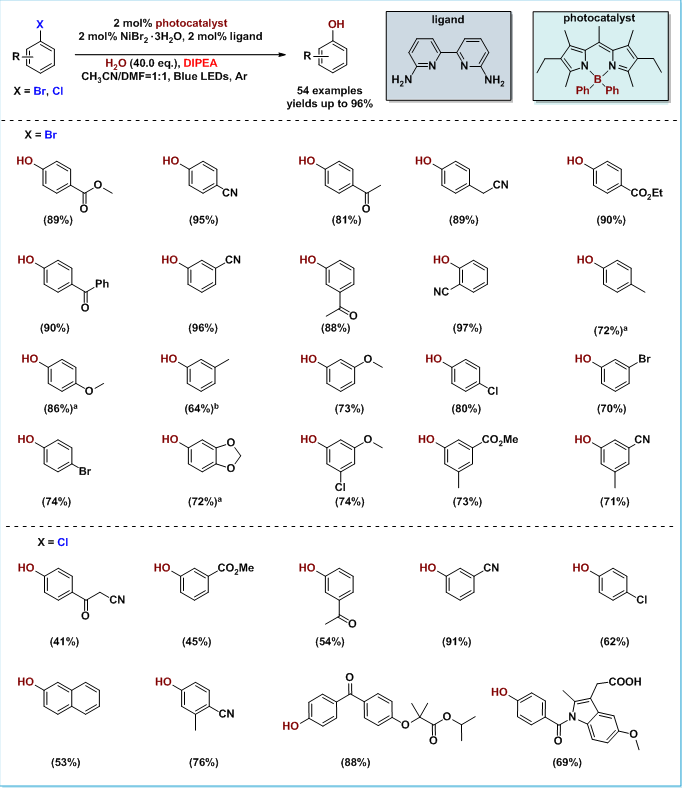 酚类化合物是一类非常重要的有机合成中间体,广泛存在于农药、医药、材料、天然产物当中。如何高效的合成此类化合物一直是有机合成研究当中的热点问题之一。目前,合成酚类化合物主要是以金属钯、铜作为催化剂,强碱作为羟基源,对卤代芳烃进行羟基化反应。但此类合成方法对于一些含有碱性敏感官能团的底物是无法实现。发展更高效的方法,廉价的催化剂以及合适的羟基源对卤代芳烃进行羟基化反应仍然是一个十分重要的研究课题。针对此类问题,天使动漫