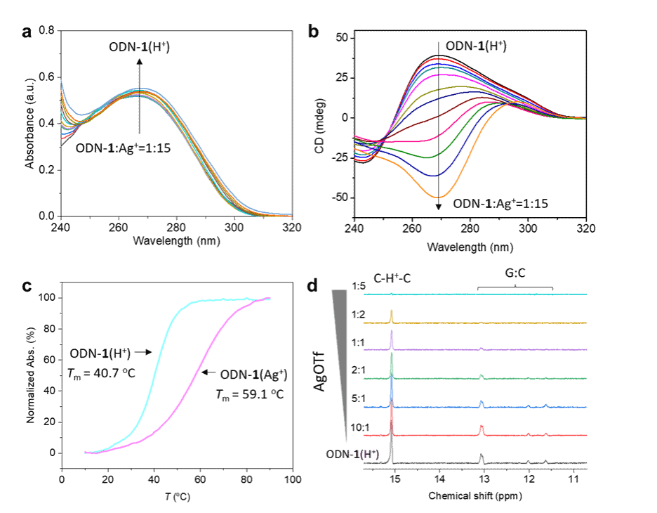 为理解手性反转现象,通过一系列物理化学技术手段对ODN-1(H+)与ODN-1(Ag+)的结构差异进行了分析。紫外可见滴定和圆二色滴定实验结果(图2a-b)表明Ag+离子破坏了ODN-1(H+)的螺旋结构及其C−H+−C碱基对堆叠,形成了具有特殊i-motif结构的ODN-1(Ag+)。熔点曲线(图2c)说明Ag+离子的添加增加了DNA的稳定性。最后,通过核磁滴定实验(图2d)确定Ag+离子依次破坏了ODN-1(H+)中的G:C:G:C四聚体和C−H+−C碱基对中的氢键。上述实验说明Ag⁺离子不仅显著稳定了i-motif结构,还重排了其螺旋拓扑结构和碱基堆叠模式。