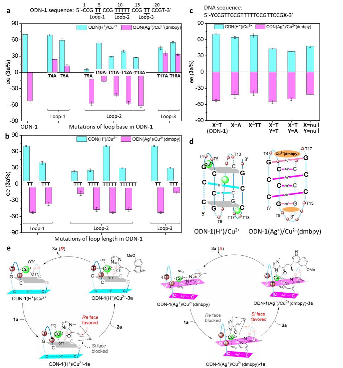 为进一步探究Cu2+物种的结合位点,系统地进行了DNA突变实验(图5a-c)。突变实验结果表明3个Cu2+离子位于imDNA(H+)的三个环区,而Cu2+(dmbpy)复合物主要通过与G-Ag+-G碱基对堆叠结合于imDNA(Ag+)的末端区域。基于全面的物理化学表征和突变研究,推测了imDNA杂合催化剂的初步结构模型(图5d)。最后,为阐明手性反转现象,提出了可能的催化机制。手性反转源于H+和Ag+介导的DNA形成具有相反螺旋取向和碱基配对模式的独特i-motif骨架。这些独特的i-motif结构在Cu2+中心周围塑造出截然不同的微环境,从而定向排列含氮、氧的烯酮底物,使其呈现相反的手性面攻击,进而反转了基于DNA的催化反应中的对映选择性。