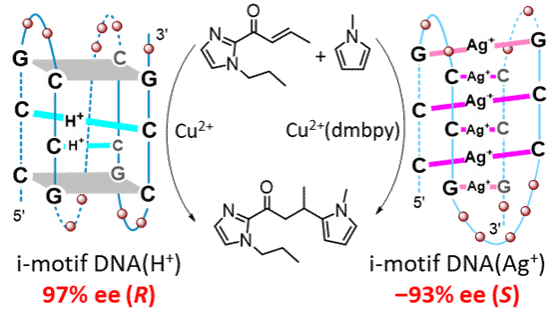 富含胞嘧啶的单链DNA可以折叠成i-motif结构,由于可编程的胞嘧啶-胞嘧啶碱基配对特性,imDNA作为一种极具前景的手性骨架,正被用于开发可调变的DNA杂化催化剂。研究表明,利用四聚体封端策略构筑了高效的imDNA(H+)杂化催化剂,并在imDNA(H+)/Cu2+与imDNA(Ag+)/Cu2+(dmbpy)体系间实现了手性反转(图1)。相比已报道的dsDNA和G4DNA的不对称催化,imDNA杂化催化剂展现出更优异的对映体选择性,最高分别获得了97%和-93%的ee值。