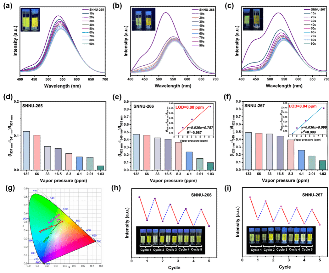 液相滴定结果表明,SNNU-266与SNNU-267对DCP表现出显著荧光猝灭与红移,检测限低至0.025 ppm和0.017 ppm,响应时间小于10 秒。基于PVDF复合膜的气相检测中,两者在1.03–132 ppm范围内对DCP蒸汽快速响应,发光颜色由绿色变为黄色,实现可视识别。循环与选择性测试显示,MOF膜经三乙胺蒸汽再生后可稳定重复使用,对干扰蒸汽具有优异抗干扰性。